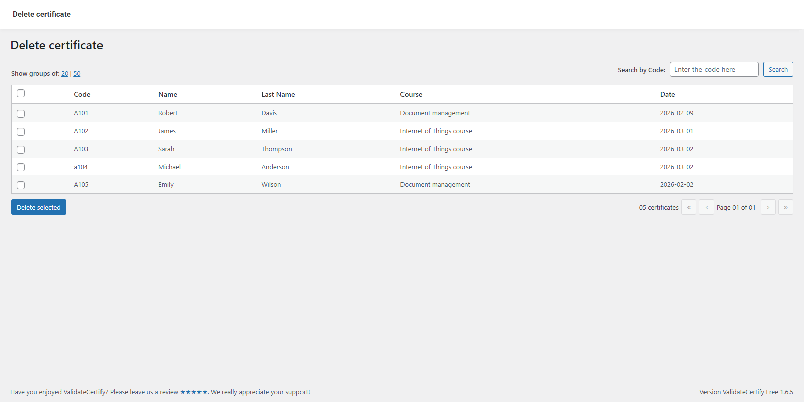 - Automatic code generation: Generate unique codes when uploading certificates.